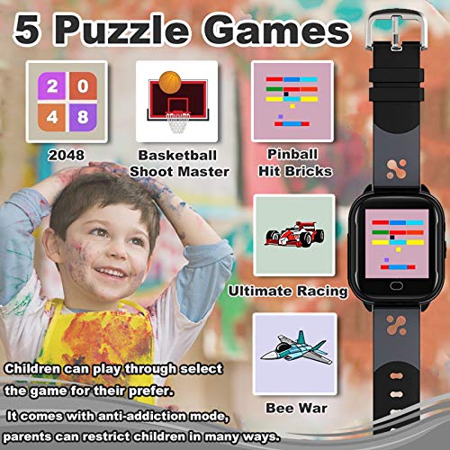 Grappig spel horloge voor kinderen – Deze kids smartwatch bevat 5 leren spelen: 2048, Basketball Shoot Master, Bee War, Pinball Hit Bricks, Ultimate Racing. Kinderen kunnen spelen door selecteren van het spel voor hun voorkeur, Handig om kinderen logisch denken vermogen en hand-hersenen coördinatie vermogen te verbeteren.